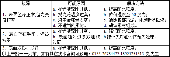 拋光液使用一定時間后,如果銅件光澤度達不到要求,可以添加三分之一的原液。如果當延長時間仍然達不到拋光要求的,則應(yīng)更換清洗槽中的清洗液。